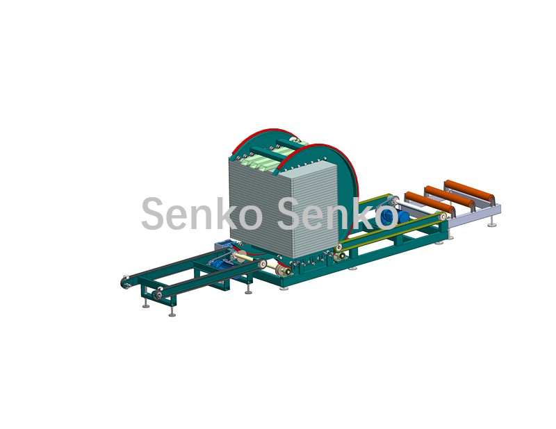 После укладки пустых поддонов они по роликовому конвейеру перемещаются к механизму поворота штабелей. Механизм поворота позволяет поворачивать штабелированные блоки на 90 градусов, обеспечивая возможность удаления отверстий в блоках с помощью вилочного погрузчика, что заменяет ручное вращение, экономит трудозатраты, предотвращает несчастные случаи и защищает блоки от повреждений.