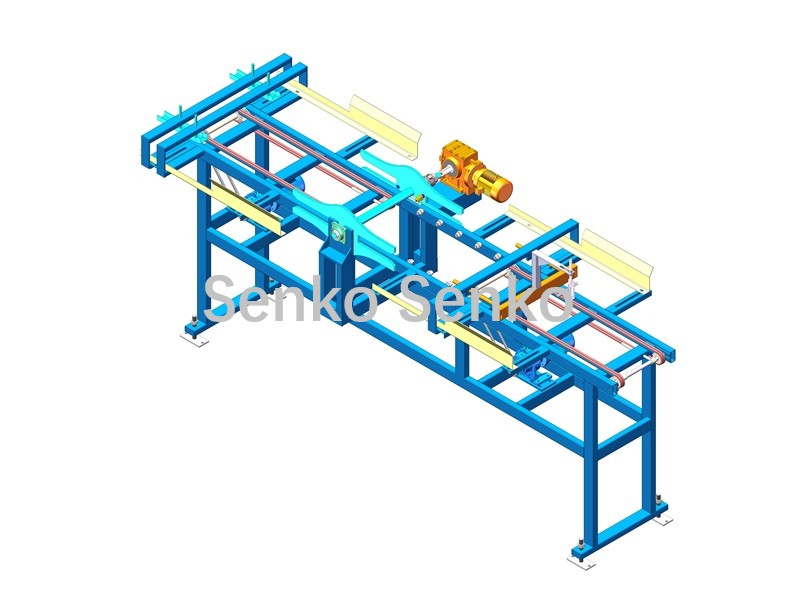 После разделения кирпичей пустой поддон транспортируется вперёд по цепи. На цепном конвейере можно установить механизм переворачивания для переворачивания пустого поддона, после чего пустой поддон поступает в машину для паллетирования.