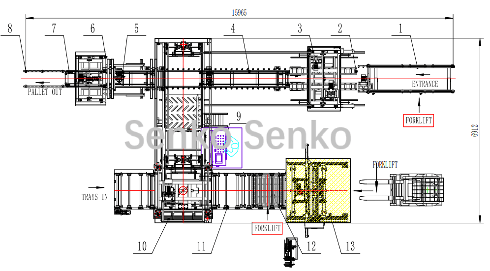 | 11. Лоток для укладки | 12. Конвейер лотков | 13.Упаковочная/зачистная машина |