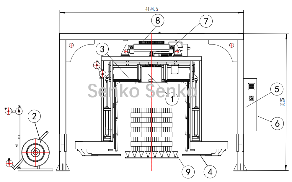 При неподвижной стопке кирпичей/блоков упаковочная головка и паз для строп на раме перемещаются вперёд и назад для горизонтальной обвязки предметов ПЭТ-лентой. Затем упаковочная головка и паз для строп поворачиваются на 90° для вертикальной обвязки предметов ПЭТ-лентой.