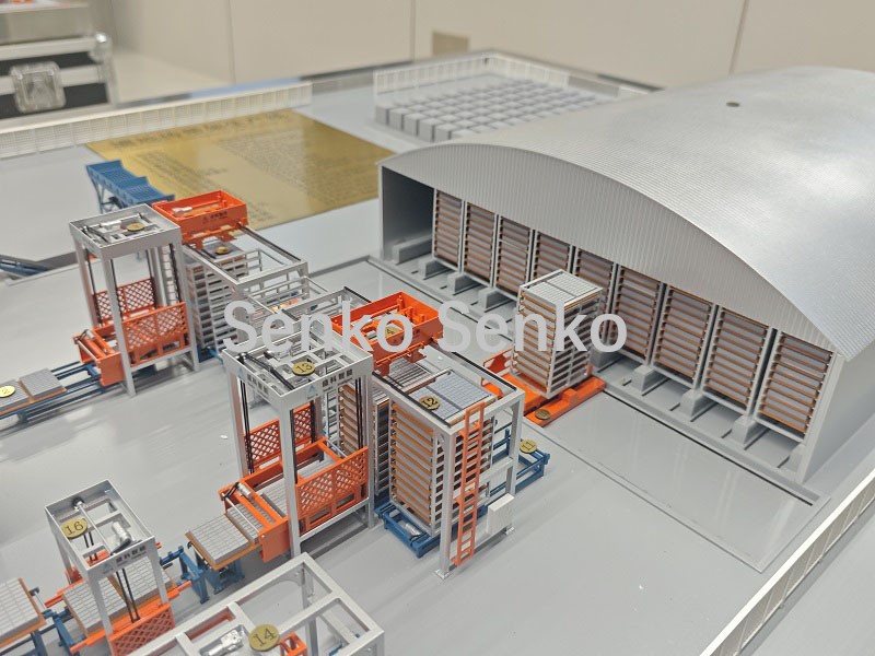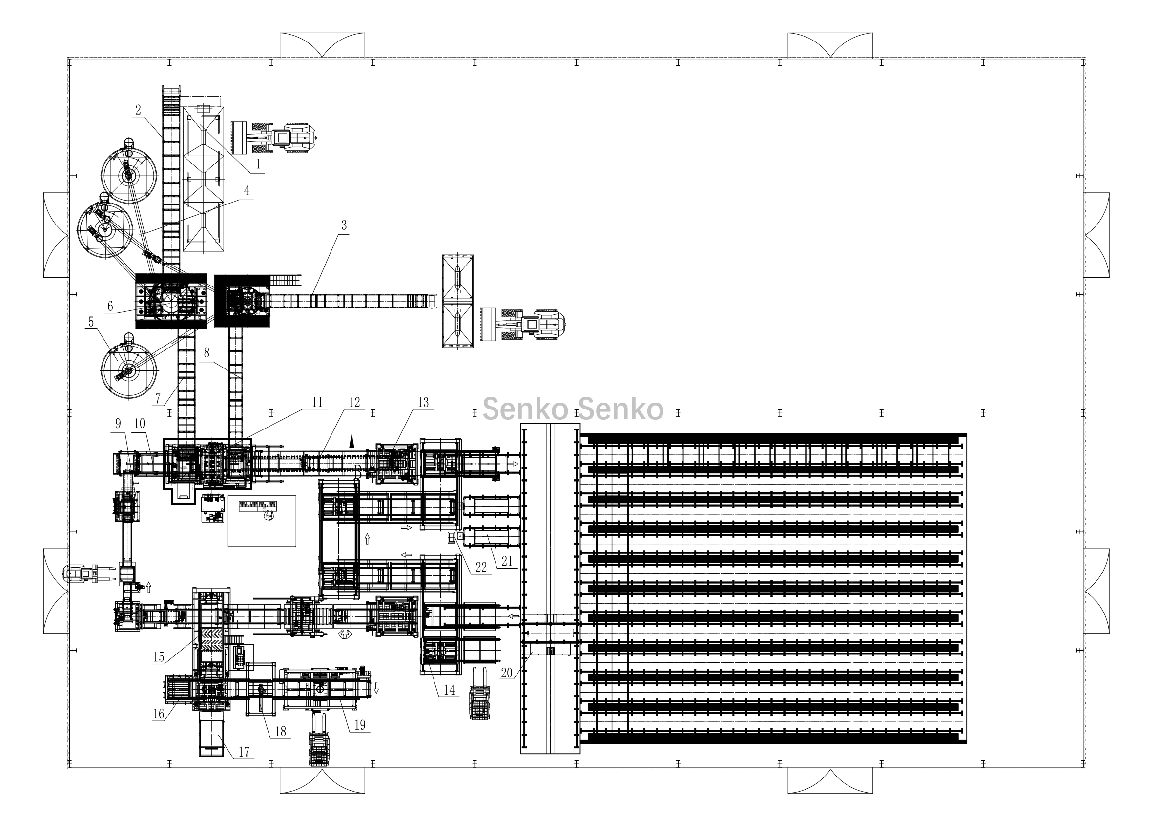 | 7. Формовочная машина | 8. Конвейер для поддонов | 9. Загрузка поддонов в стеллаж | 10, передача стойки | 11, кормление стойкой на RGV | 12. Тележка для переноса RGV |