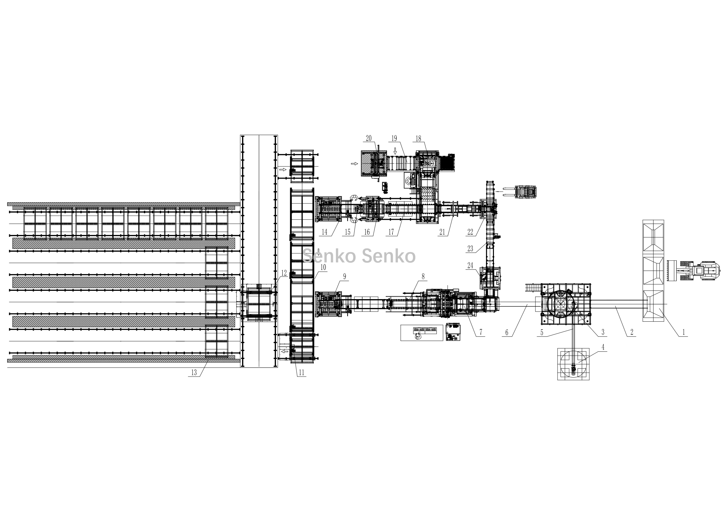 | 19. Штабельный конвейер | 20. Машина для удаления упаковочных материалов | 21. Конвейер для пустых поддонов | 22, Паллетизатор | 23. Конвейер для штабелирования поддонов | 24. Загрузка поддонов |