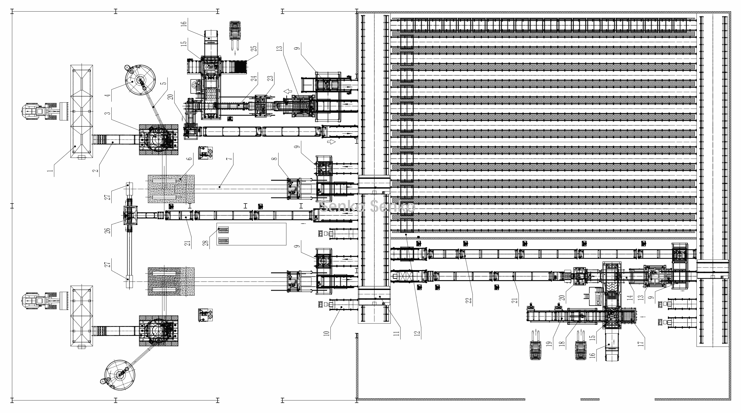 | 25. Машина для зачистки | 26. Подача поддонов на линию | 27. Каркас для хранения поддонов |